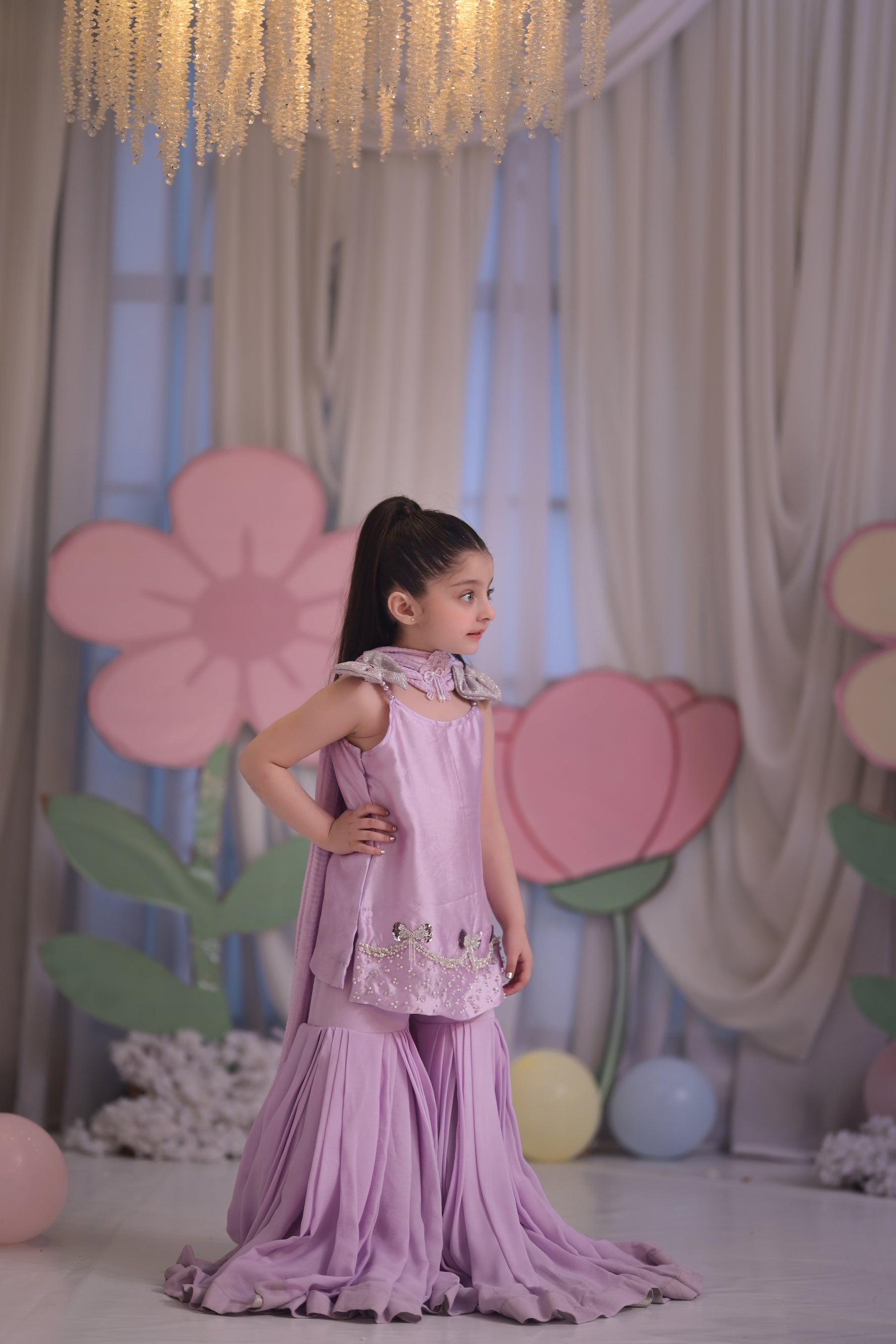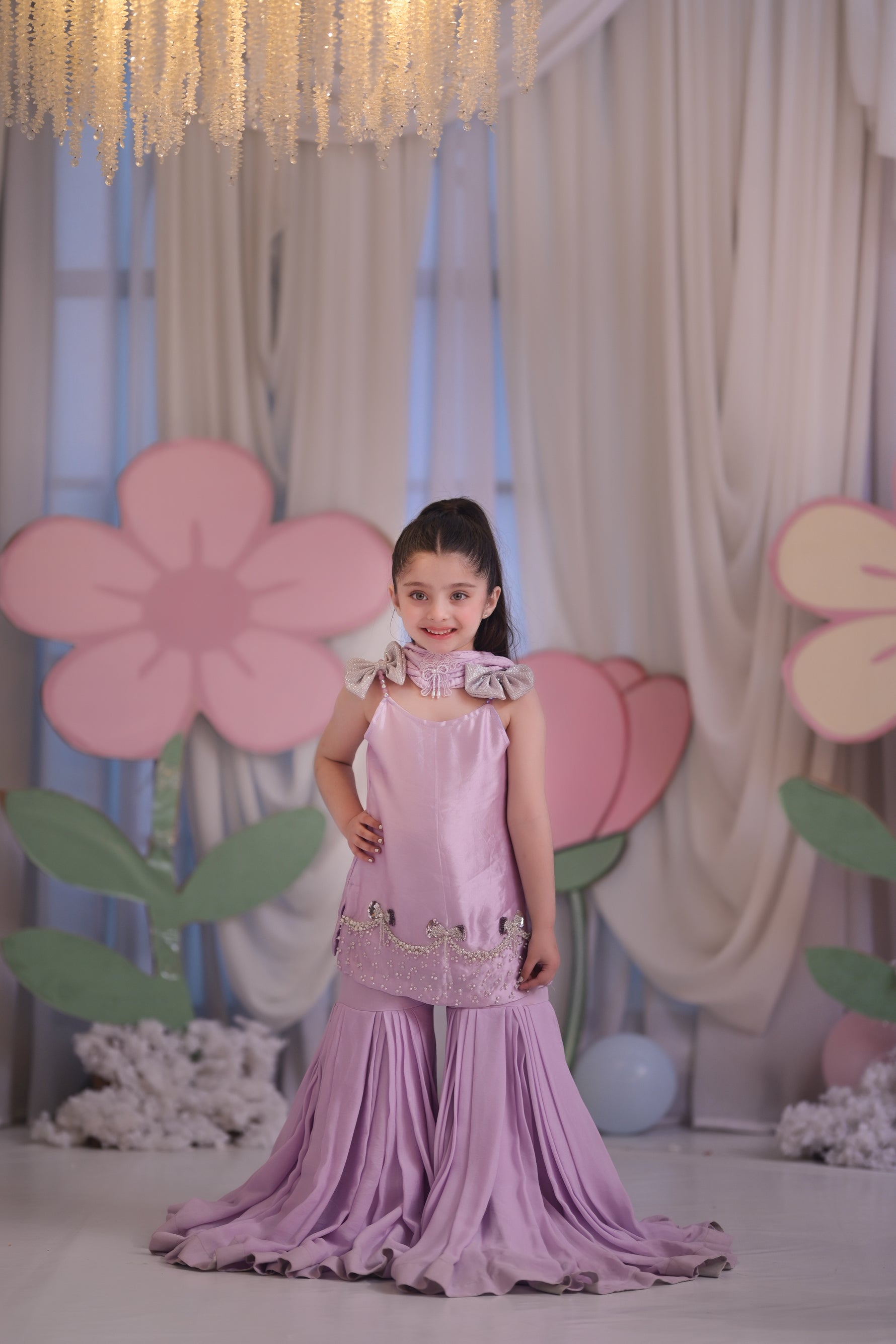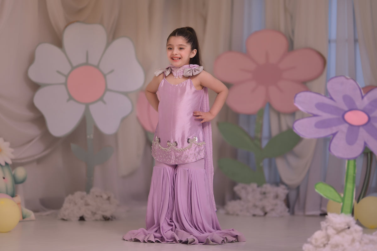 A dreamy lilac couture set featuring a sleek embellished short shirt with delicate bow accents, paired with dramatic floor-touch flared sharara pants. Sweet, elegant, and made for little fashion princesses who love to shine.