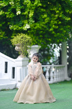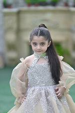 Its silver sequin Swarovski work captures the night’s quiet sparkle, while soft champagne organza sleeves flow like dawn-lit clouds.